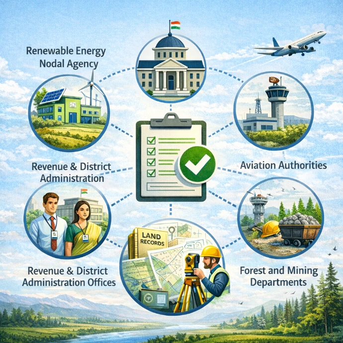 We coordinate approvals across relevant authorities, including State renewable energy nodal agencies, Revenue and district administration, Aviation authorities, Survey authorities and land measurement offices, Forest and mining departments.